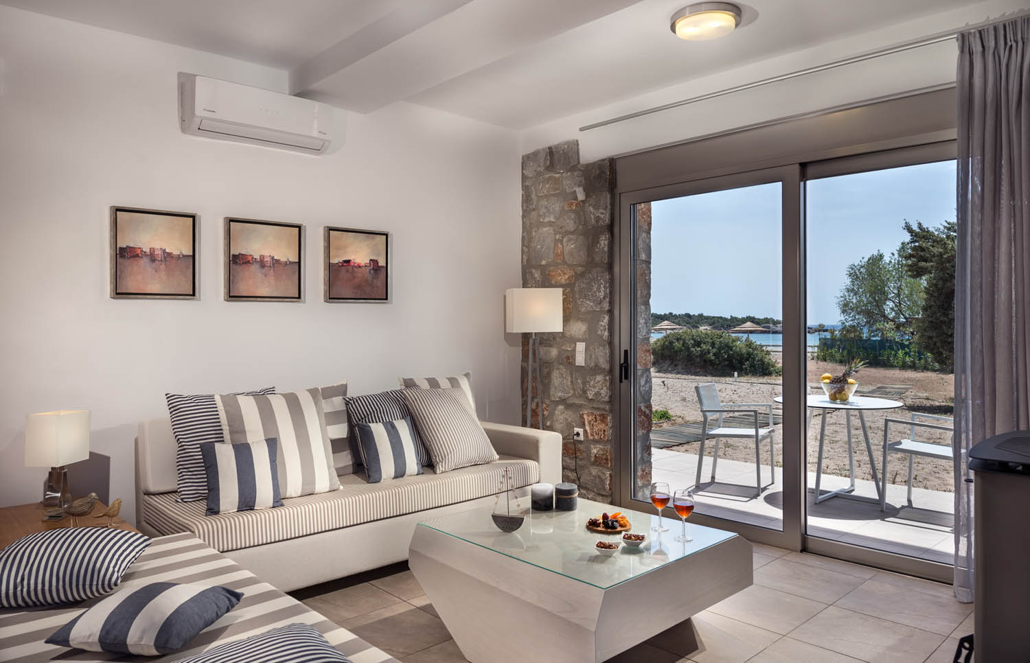 The exterior of this private, exclusive villa is as appealing as the interior. The villa owns a private 32m2 swimming pool with complementary designer wooden sunloungers and a shaded private veranda with outdoor sitting area, ideal for dining, writing or just absorbing all the beauty of the surrounding environment. Alternatively, our guests may use another set of private sunbeds on the beach, and be served snacks and refreshments from the beach bar (summer season only).